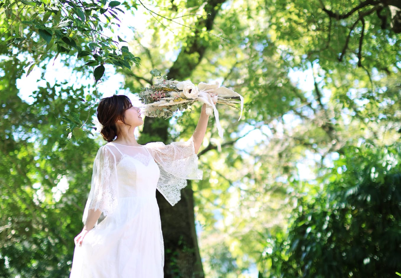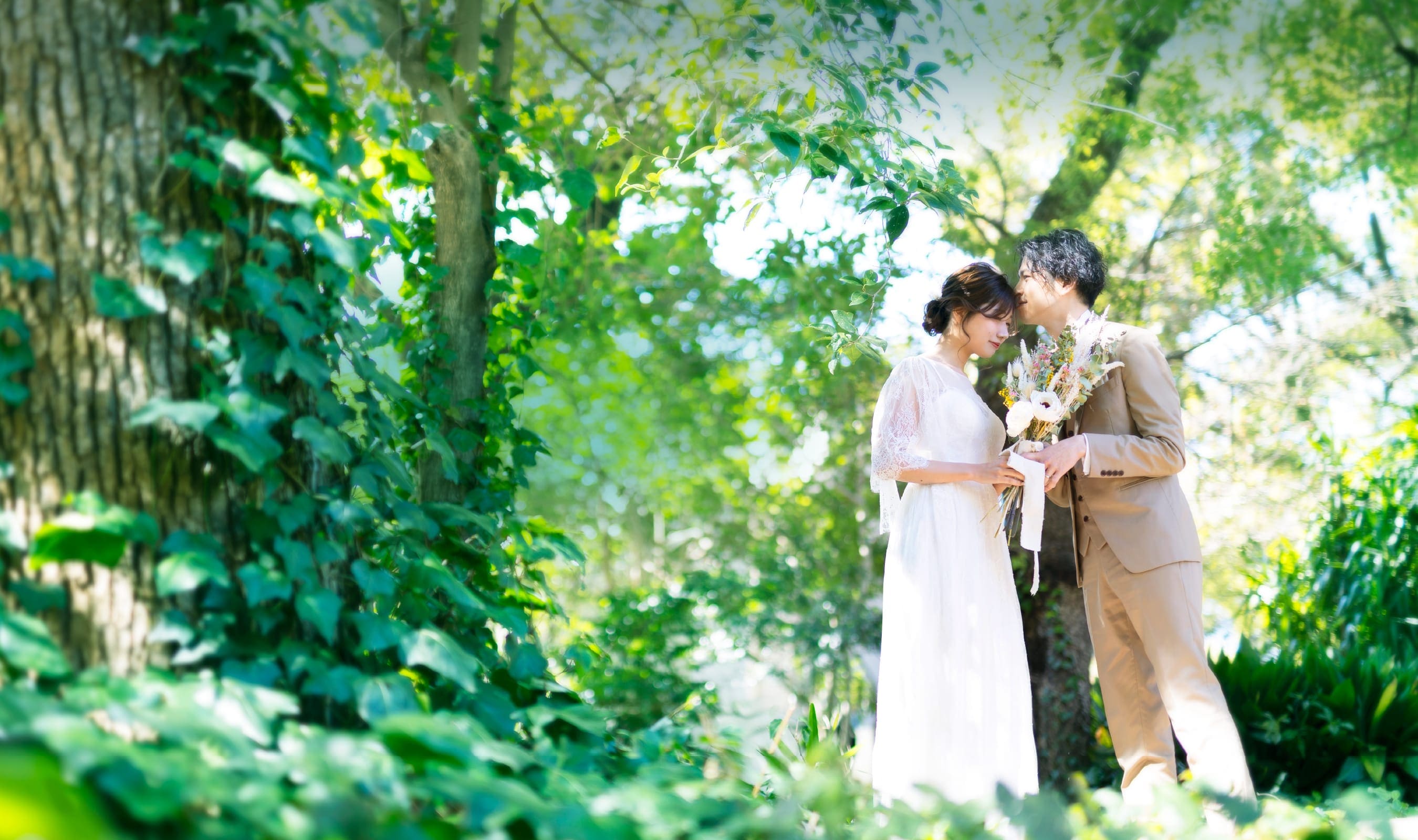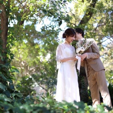 美しい木々の中で寄り添うおふたりを