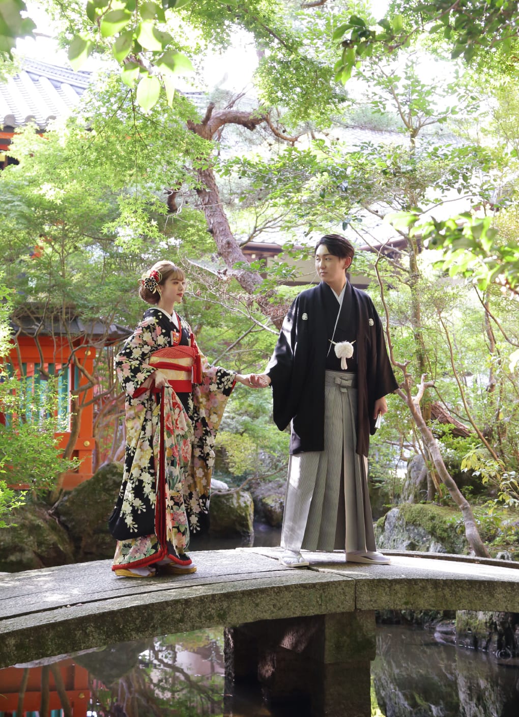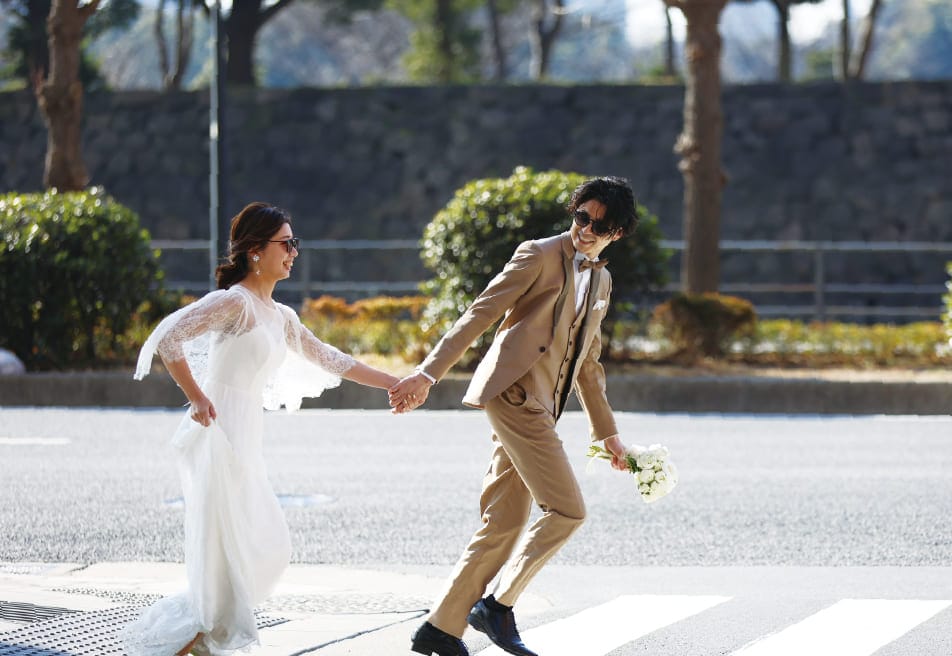 お二人のお好きなタイミングで、いつでも撮影可能です。セレモニーの前に撮影してウェルカムボードや引き出物などのグッズに、桜や紅葉など季節を感じるシーンでのショットを年賀状や挨拶状にするなど、撮影のタイミングによって写真の活用の幅は広がります。
