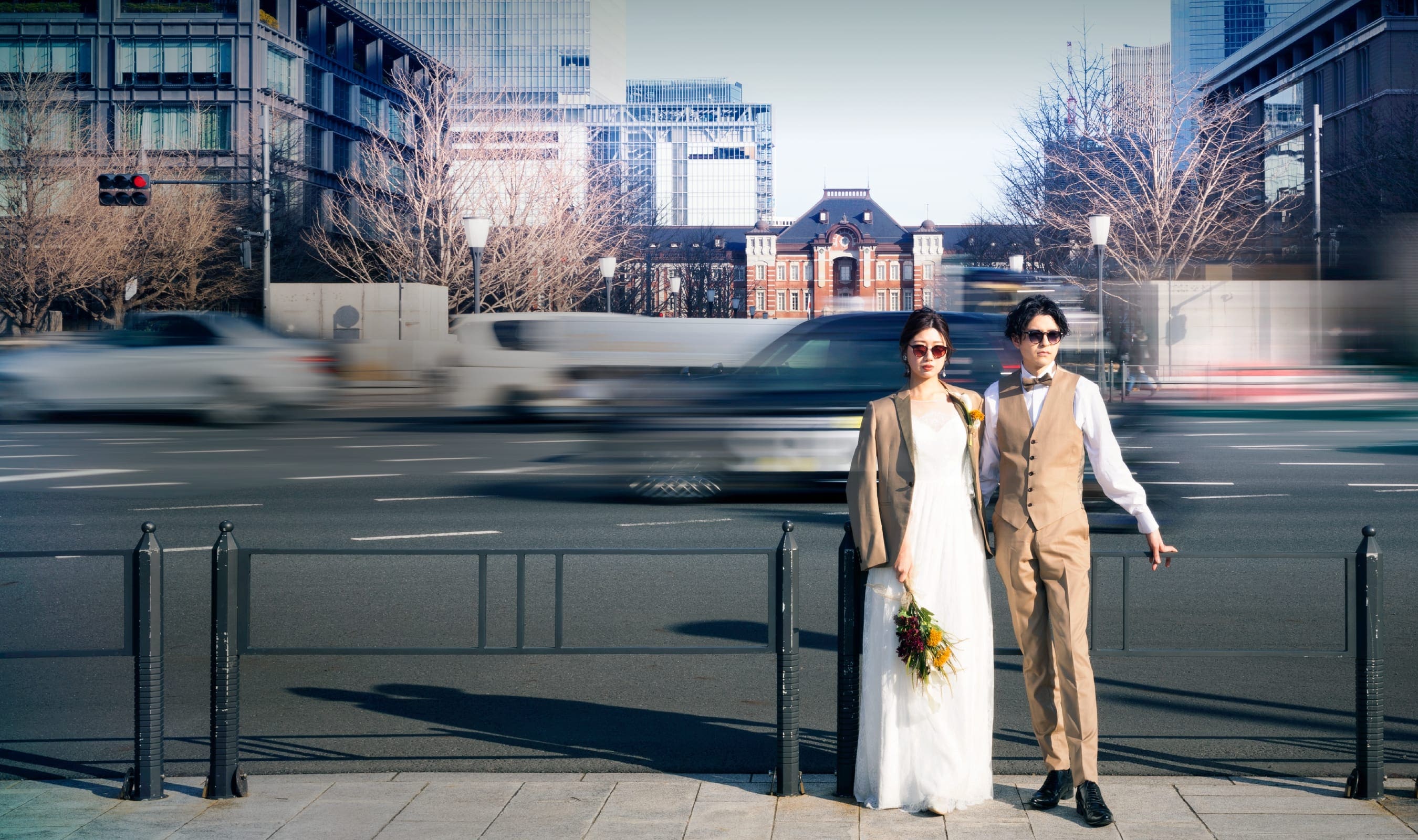 見える近代的な高層ビル。新婦の美しい佇まいと、