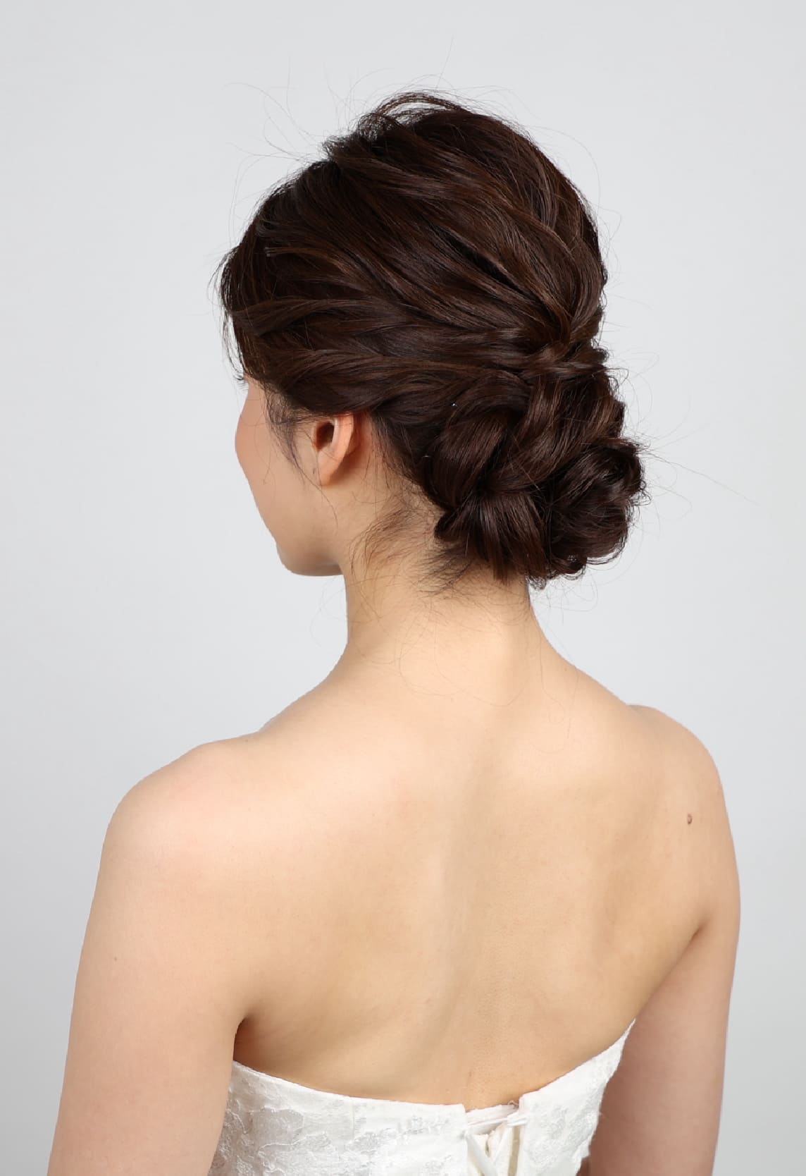 低い位置で、毛先を丸くまとめた