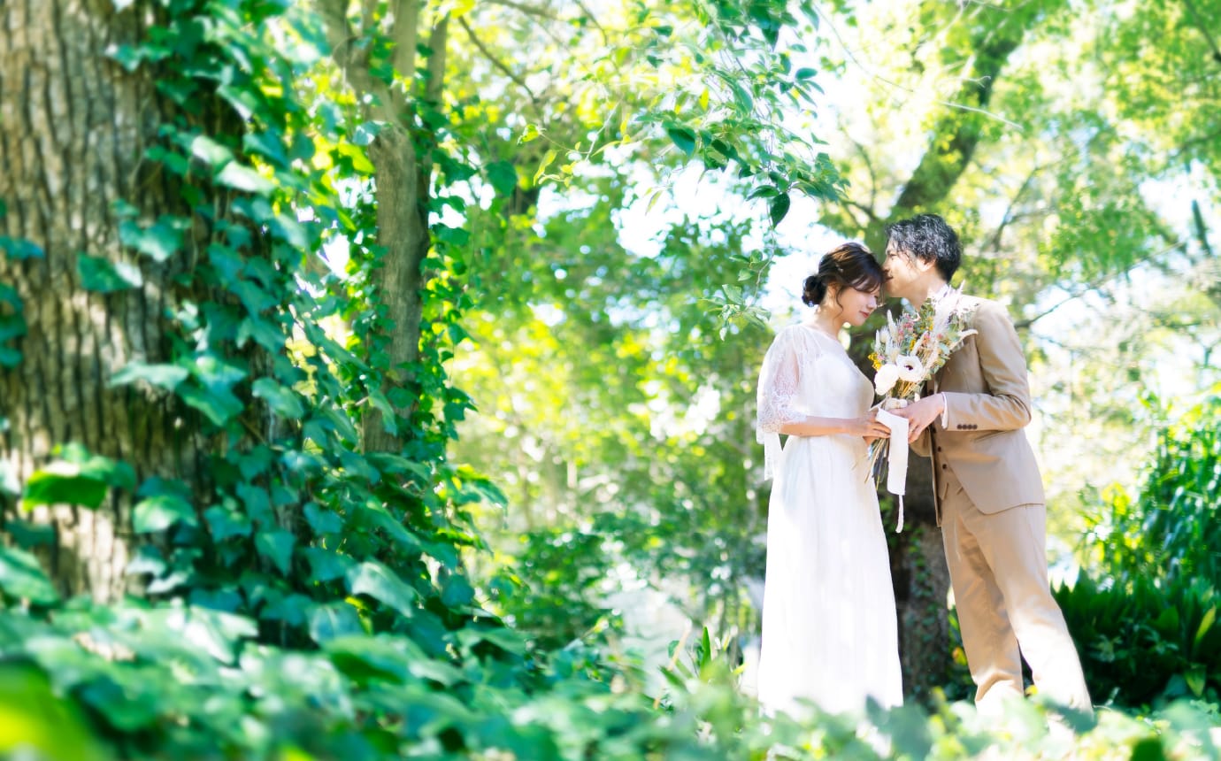 美しい木々の中で寄り添うおふたりを